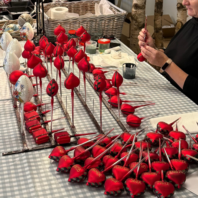 I butikken arbejder vores malere med pensel, farver og glimmer, roligt og koncentreret. Ét ornament ad gangen.