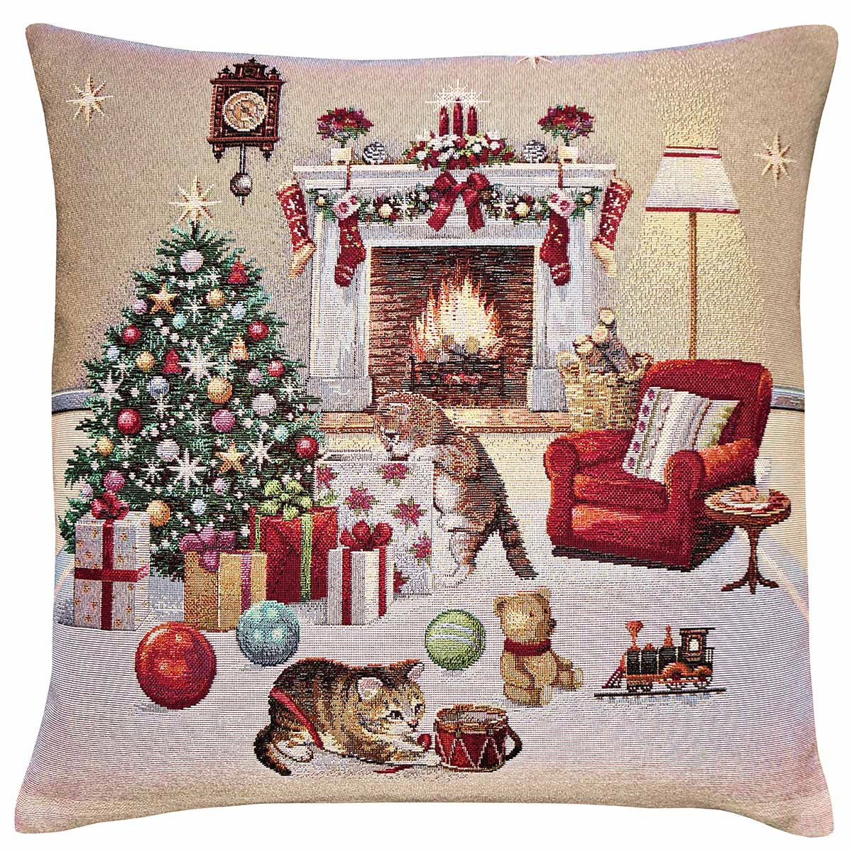 Pudebetræk med motiv af killinger der leger i den smukt pyntede julestue.