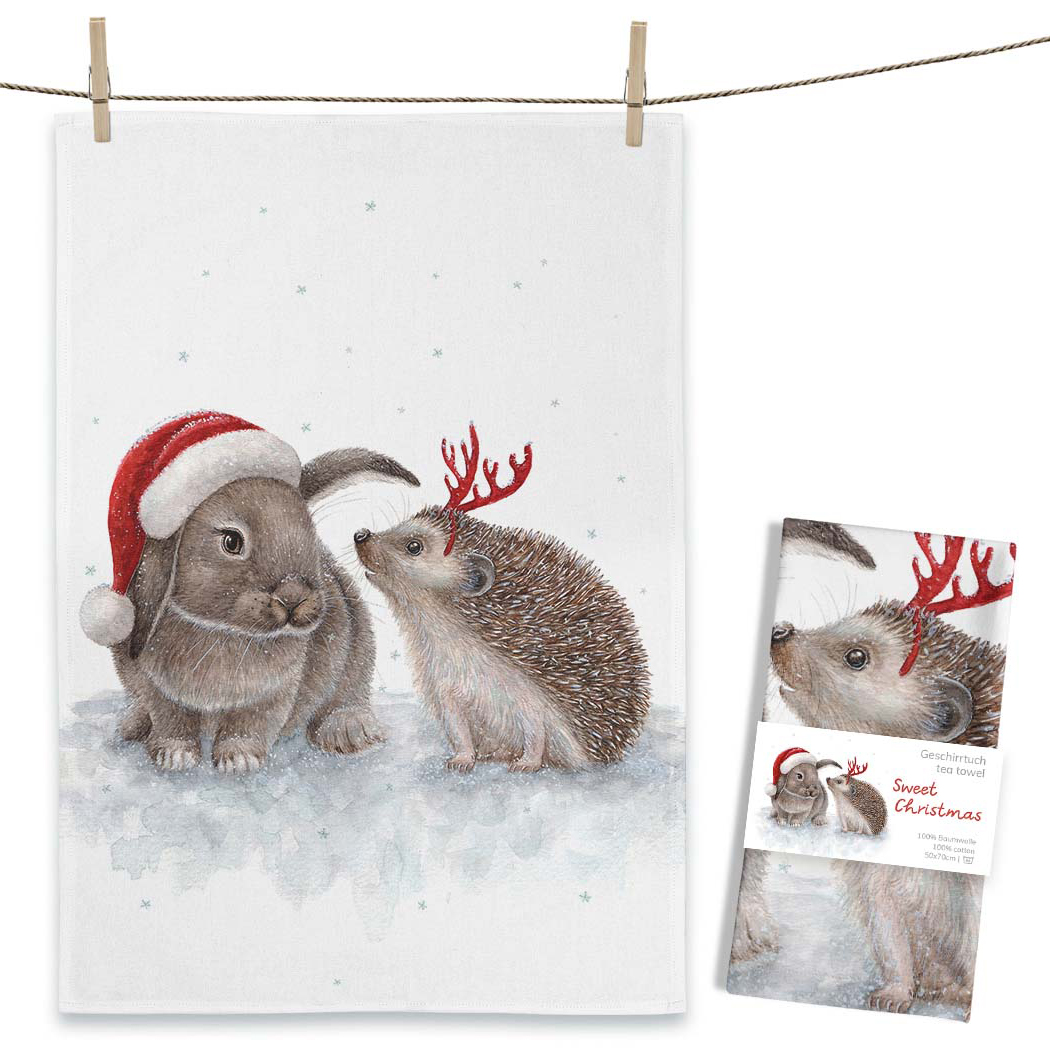 Juleviskestykke med sødt motiv af en kanin og et pindsvin.