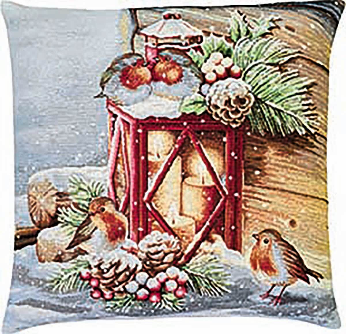 Pudebetræk der pynter med en fugl, der holder sig varm af en lanterne.