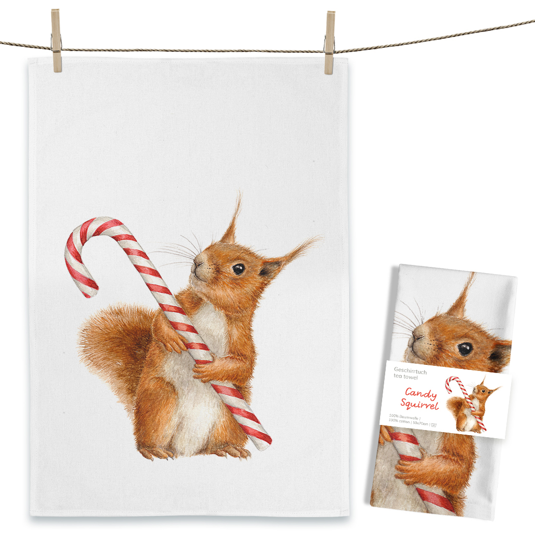 Juleviskestykke med sødt motiv af et egern som holder en sukkerstok