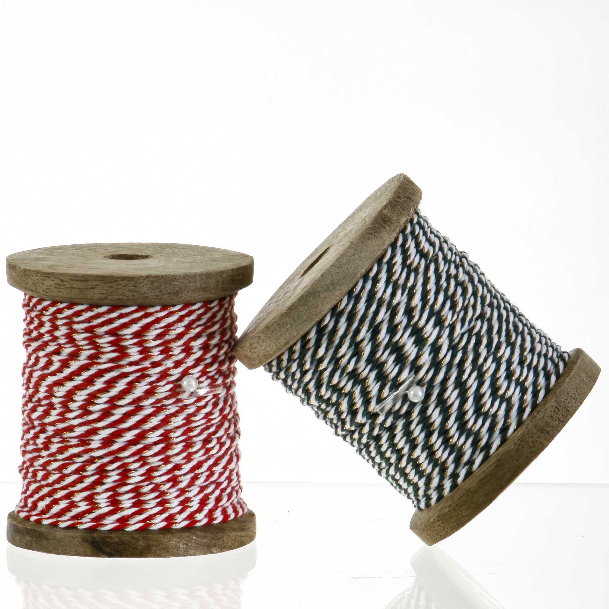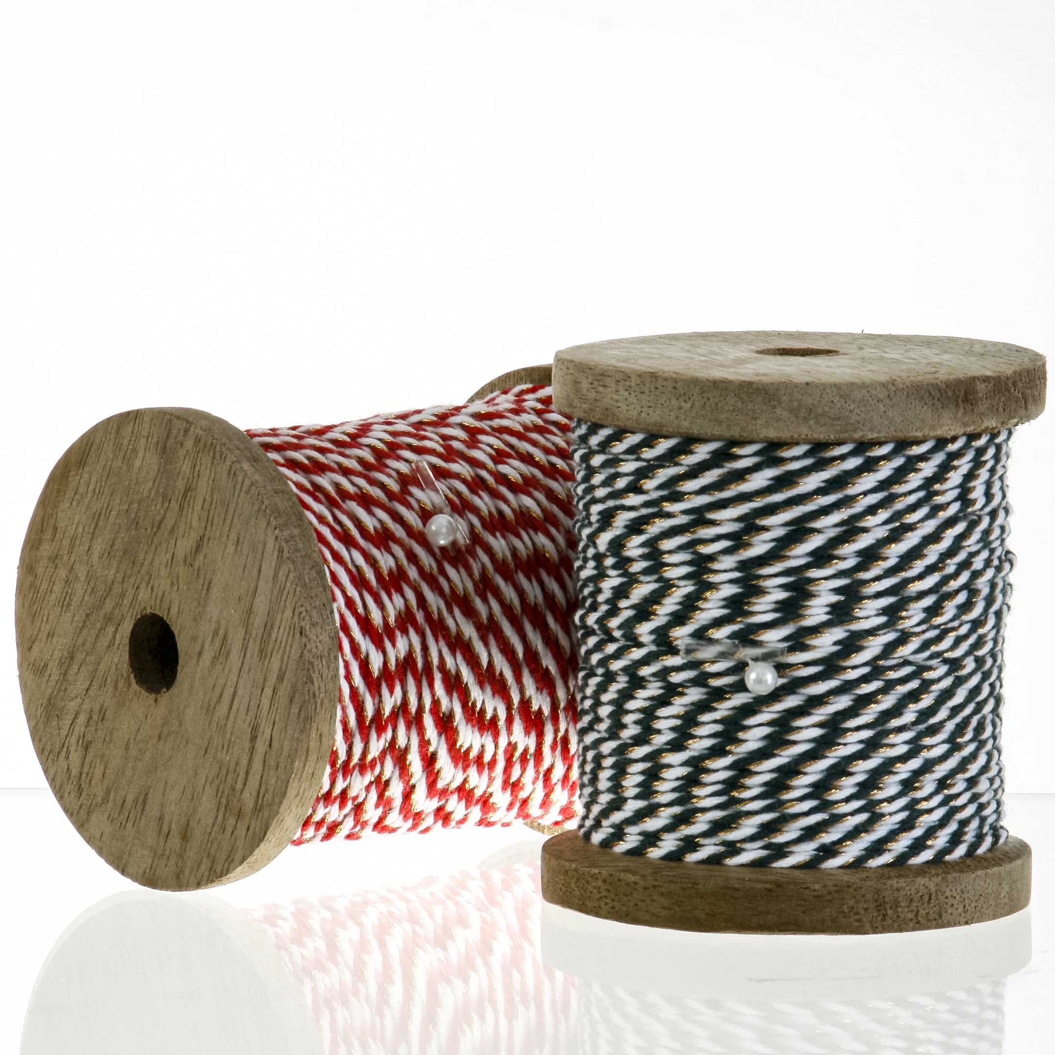 Rød og hvidstribet bomuldssnor snoet med en tynd guldfarvet snor.