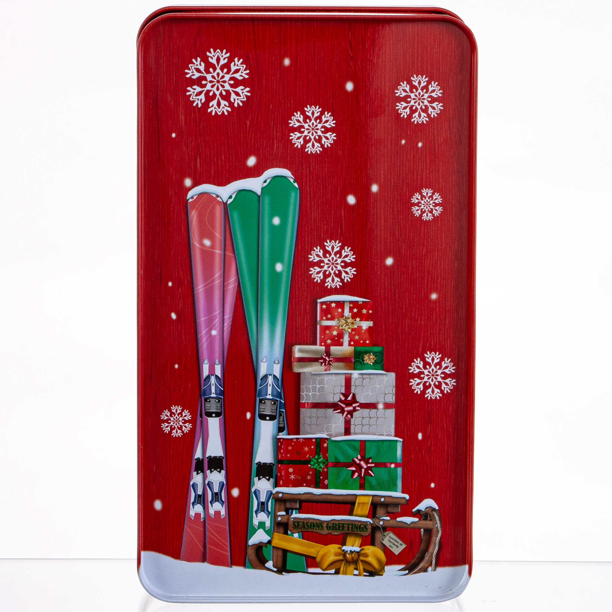 Den lille fine dåse med det hyggelige julemotiv kan benyttes som kagedåse, til konfekt eller juleslik eller blot som dekoration.