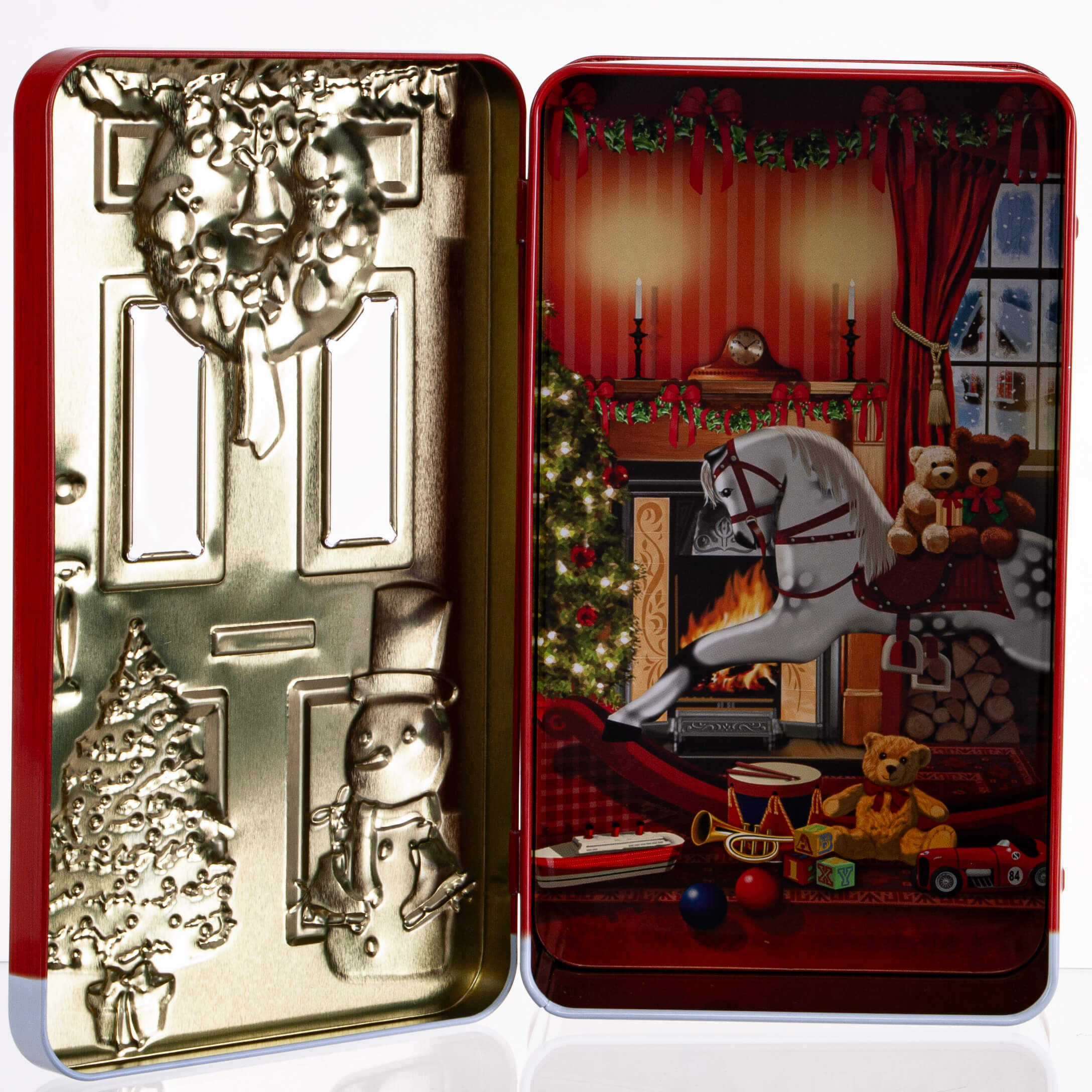 Kagedåse rød julepyntet dør med krans, juletræ og snemand. Sød at opbevare julens godter, slik, knas og kager i – men også en hyggelig æske til dekoration, der skaber hygge og stemning i dit hjem.