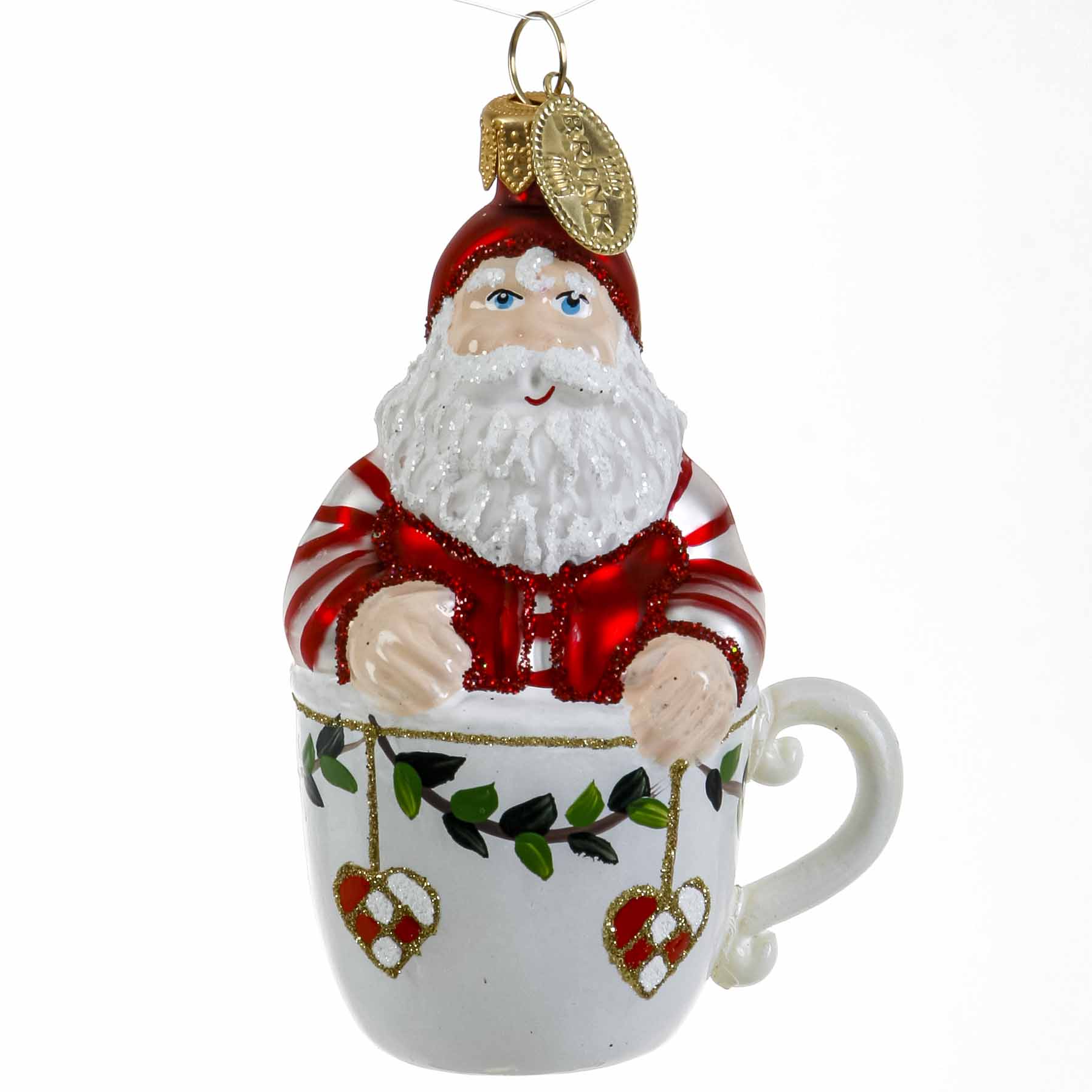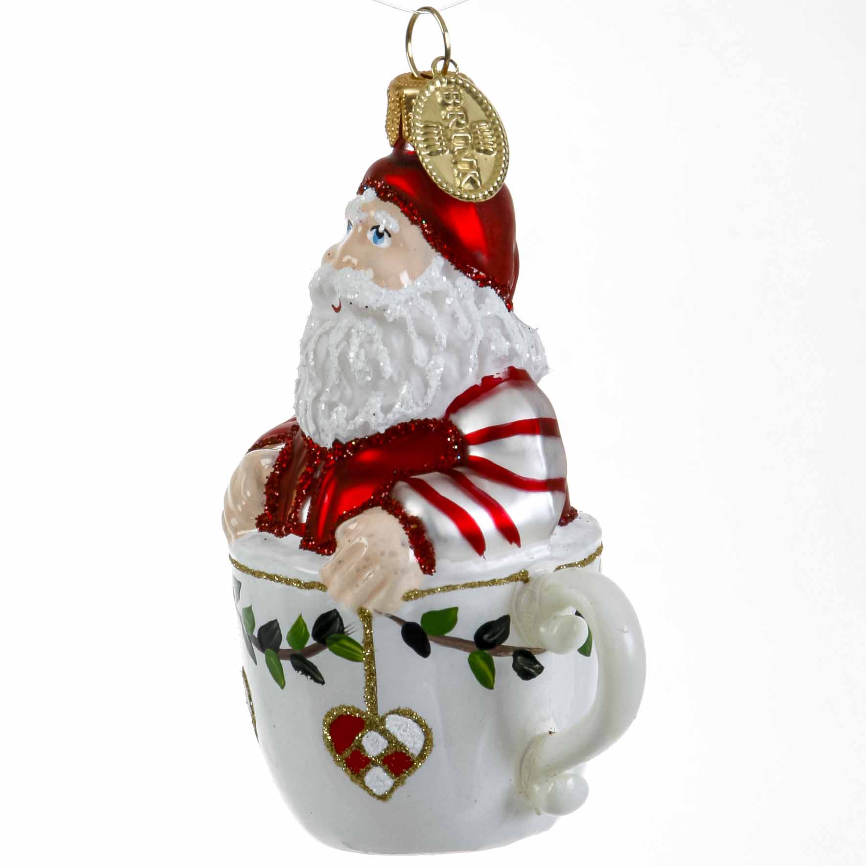 Nisse i kop, 8 cm som julekugle. Koppen er dekoreret med en ranke og fine flethjerter. Sjov og anderledes julepynt. Gaveidé til alle der holder af Brink Nordic julekugler.