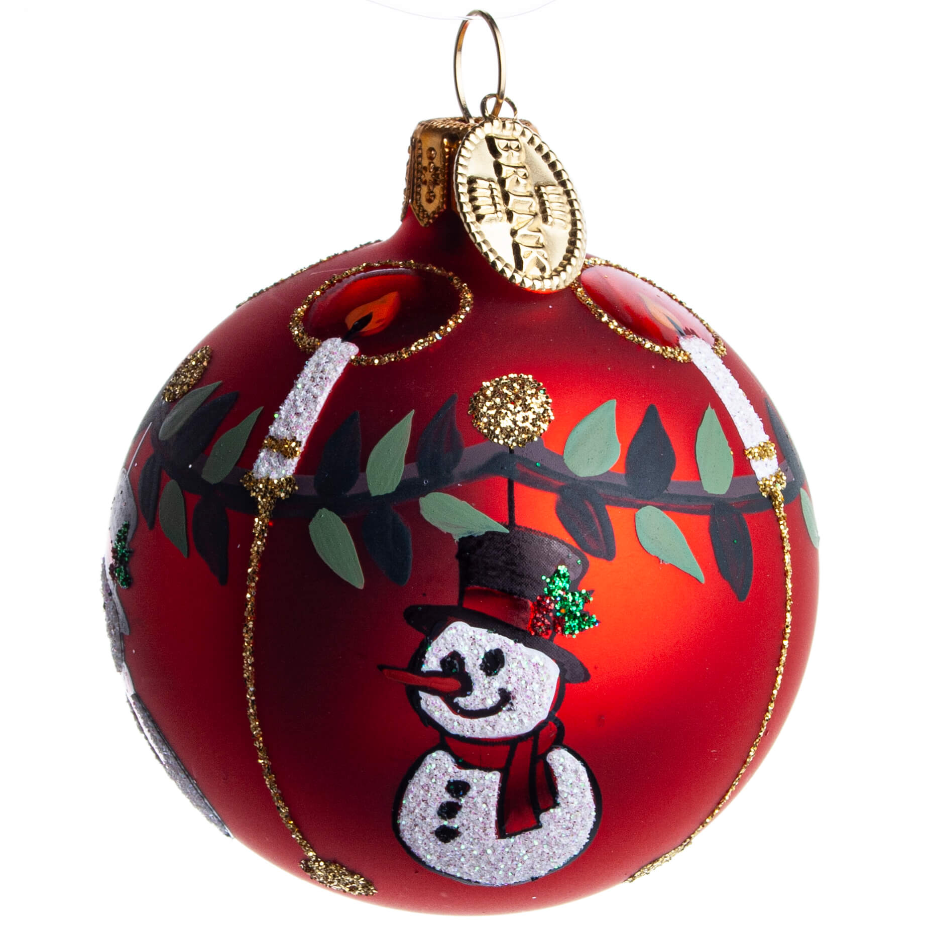 Rød favorit kugle med snemand.  Favorit kuglerne fra Brink Nordic er i 2018 med håndmalede snemænd. De fåes i både 6 cm som denne og i 8 cm.