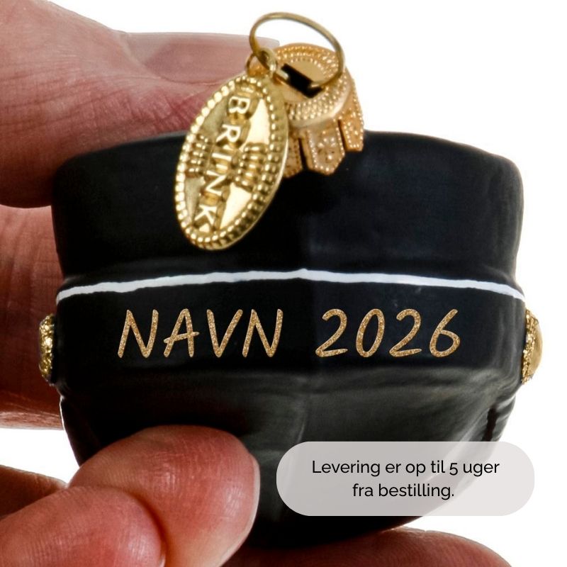 • Studenterhuen er hånddekoreret og teksten påføres med glimmer.