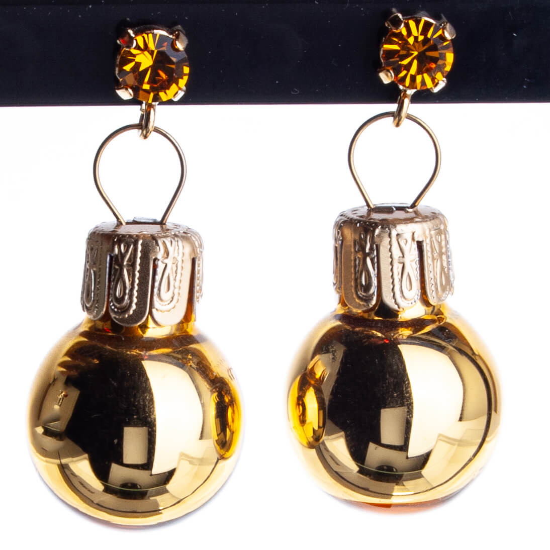 Søde og sjove øreringe, guldfarvede, der bringer juleglæde. De små julekugler i glas måler 2 cm, er perfekte til at give dit outfit et festligt præg.