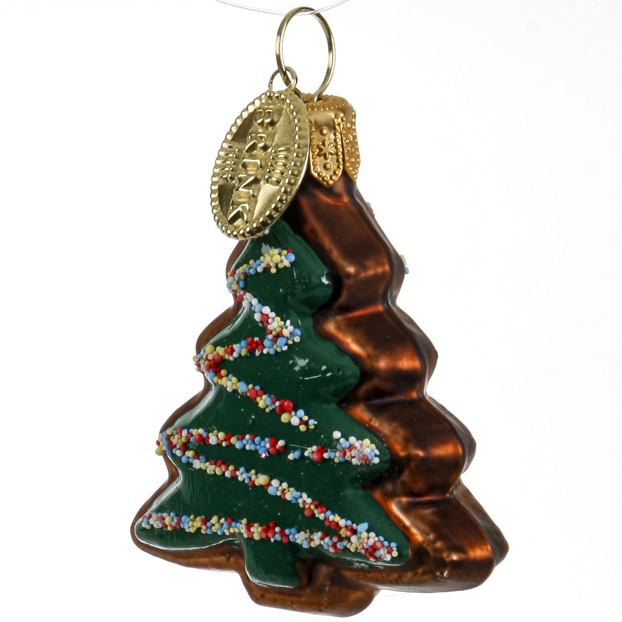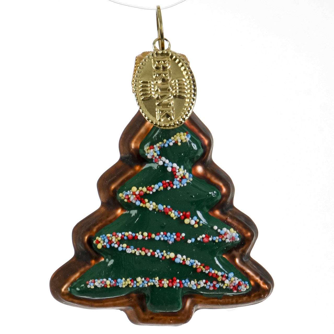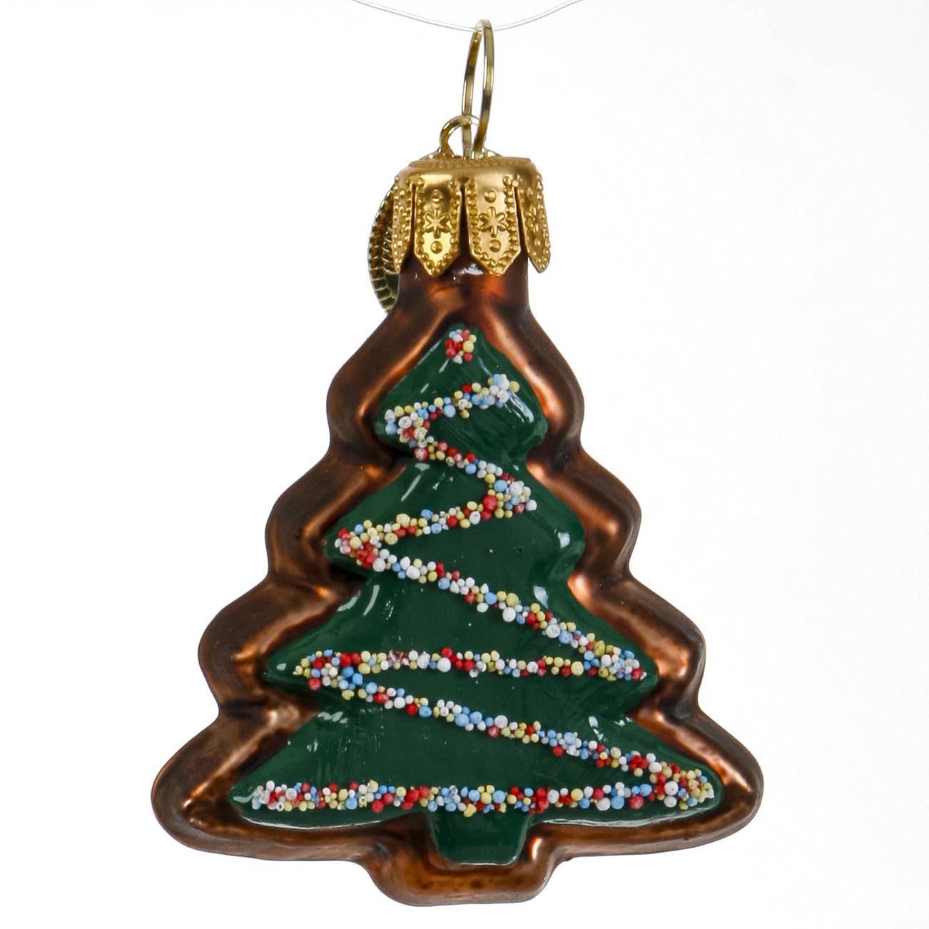 Kage formet som juletræ som glaspynt. Fint hånddekoreret julepynt.