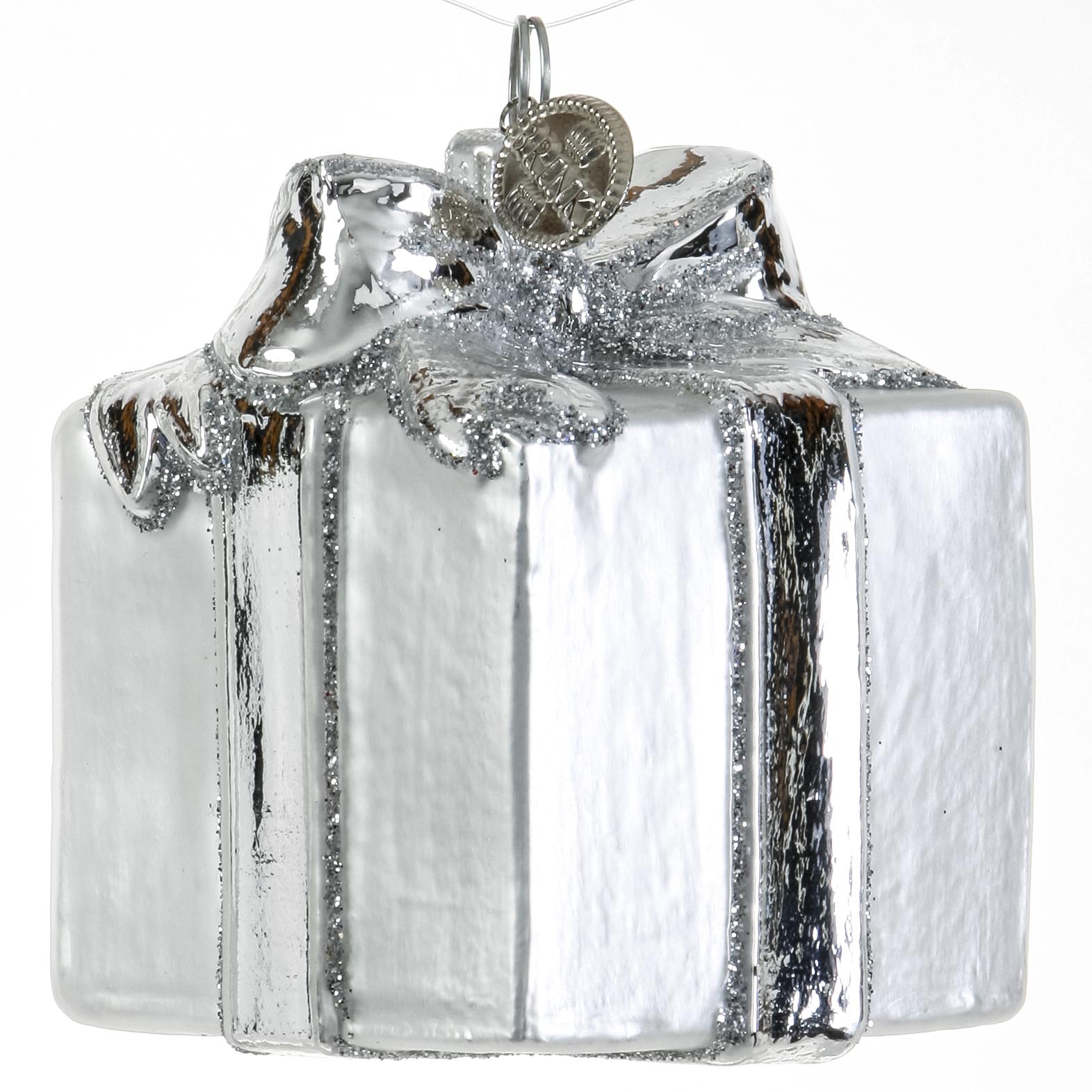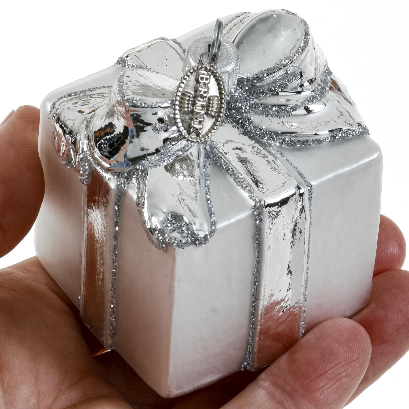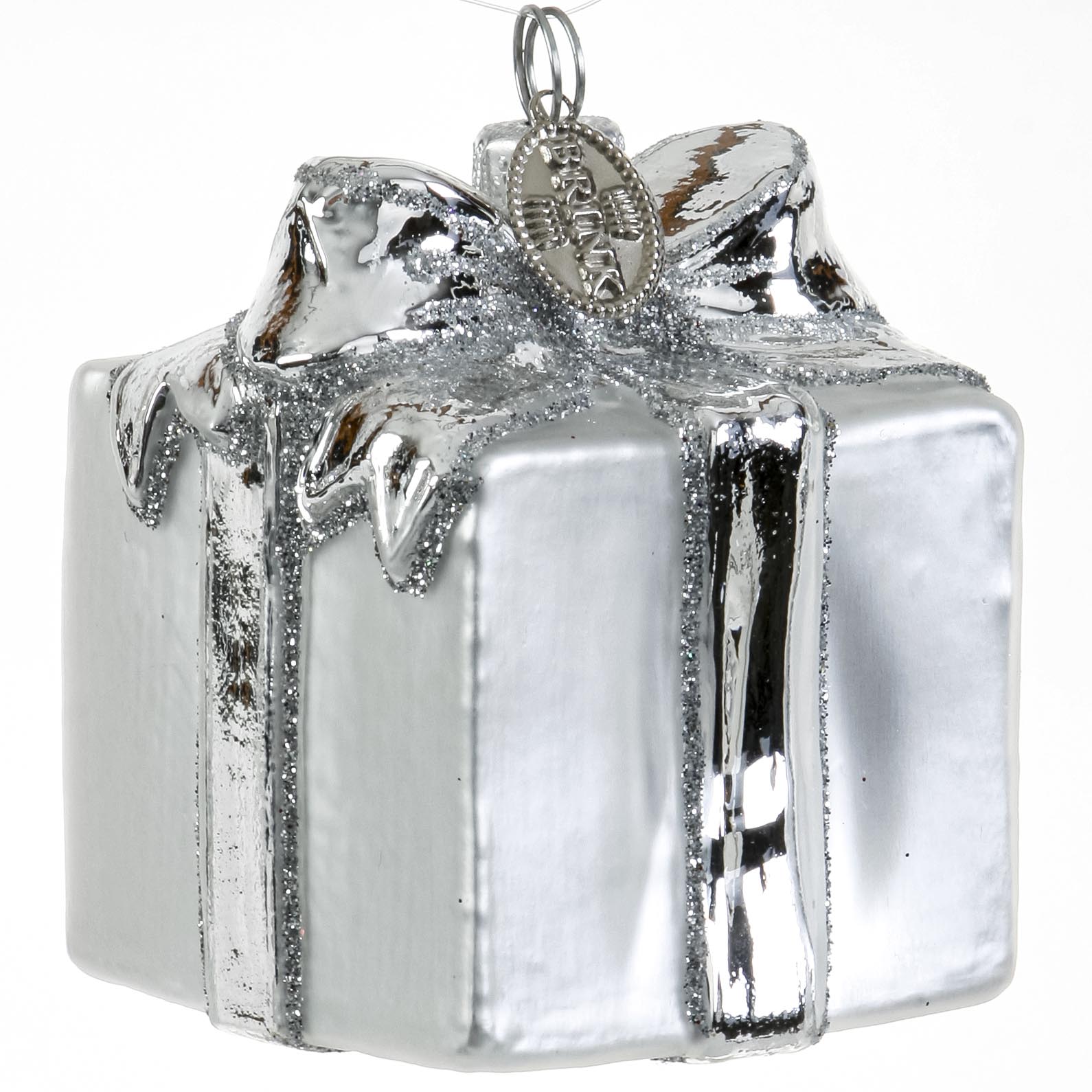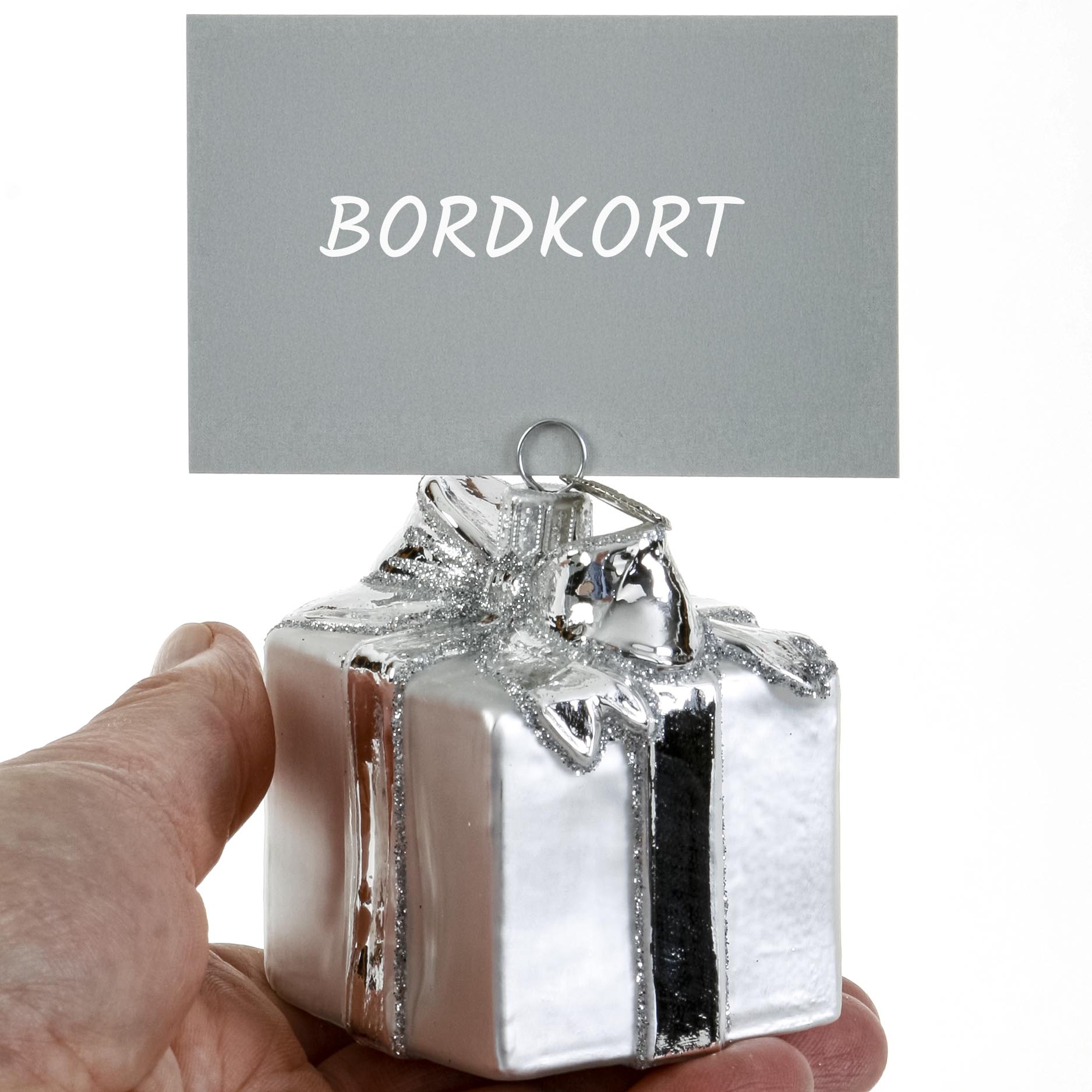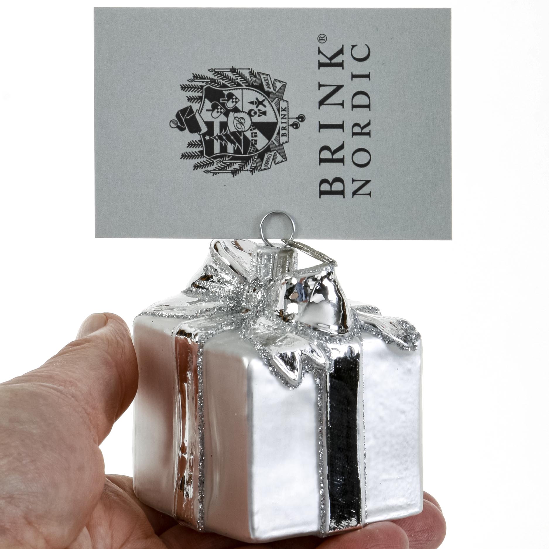 Gave sølfarvet med sløjfe. Bordkortholder og glaspynt til juletræet. Mundblæst og hånddekoreret glapsynt fra Brink Nordic.