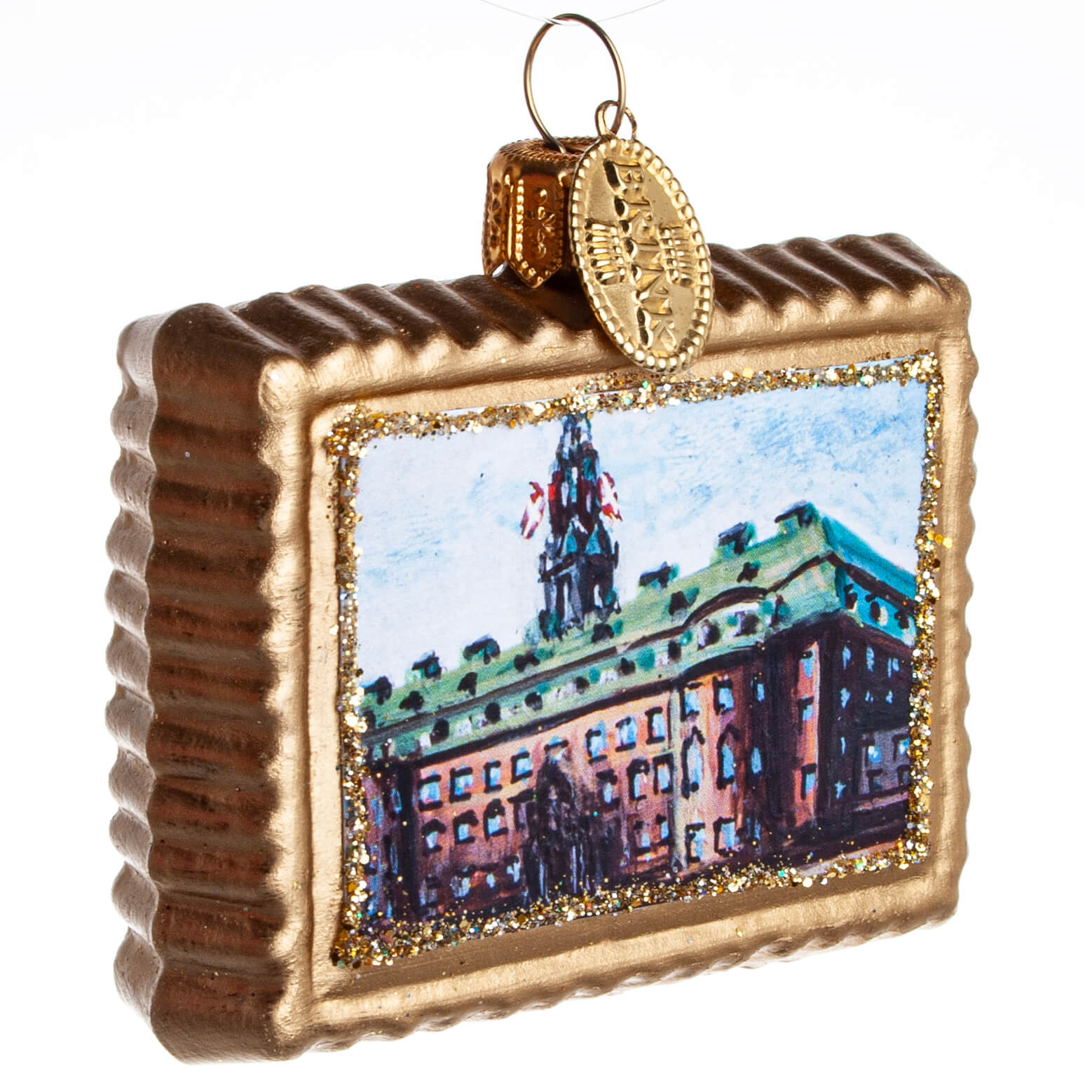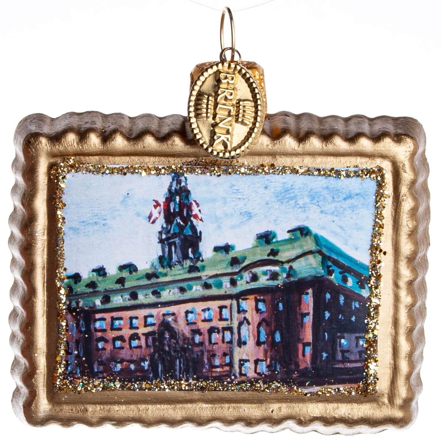 Dette elegante glaspynt med motiv af Christiansborg Slot er sammen med resten af slotsserien fra Brink Nordic indrammet i en skinnende guldfarvet ramme og måler 6 cm. Perfekt til at skabe kongelig stemning på juletræet eller troldegrenen.